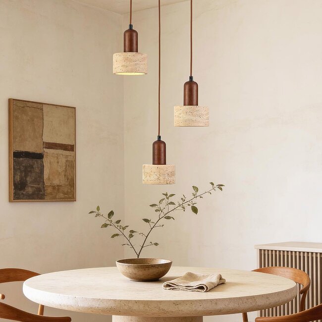 Soft light and natural textures give Muro a calm, refined look. The three round shades hang playfully at different heights from a round ceiling plate and provide even light distribution. Thanks to its compact shape and the use of natural stone and wood, Muro looks great above a dining table, in a loft or in a quiet living space. The lamp hangs from brown textile cables that enhance its natural character. Each shade is fitted with an E27 lampholder (light bulbs not included), allowing you to determine the lighting atmosphere yourself.