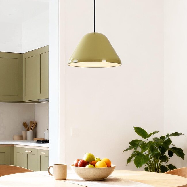 Calyx is a modern retro pendant light with a soft, glossy khaki green finish that adds warmth and calm to your interior. The wide shade ensures beautiful light distribution, while the white interior reflects the light fresh and bright. Thanks to the black textile cable, the overall look is sleek and stylish. Hang Calyx above the dining table, in the kitchen or in the living room for a calm, elegant appearance. Suitable for one E27 light source (not included), allowing you to create your own desired atmosphere.