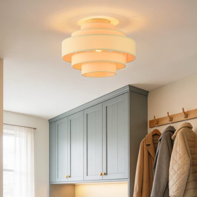 Soft in colour and sleek in design, the Mavro ceiling light brings calm and warmth to your interior. The layered fabric shade in cream beige provides an even, diffused light effect, creating an inviting look without being overpowering. Thanks to its compact design, the light is ideal for rooms with lower ceilings, while the layered structure still provides a refined and decorative effect. Mavro is equipped with an E27 lampholder (bulb not included), allowing you to choose your desired light colour and atmosphere.