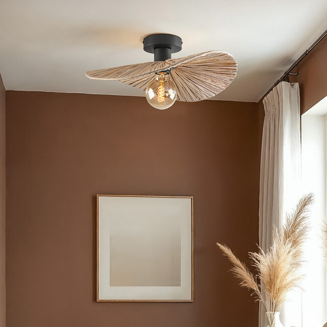 With this unique Satu ceiling light, you bring a natural and stylish atmosphere into your home. The light combines a sleek black metal frame with a handmade lampshade of braided raffia paper. Raffia, derived from the leaves of the raffia palm, is processed into versatile fibres suitable for various interior styles. Whether you have a modern, minimalist or boho-chic interior, this light adds a warm and authentic character to any space.