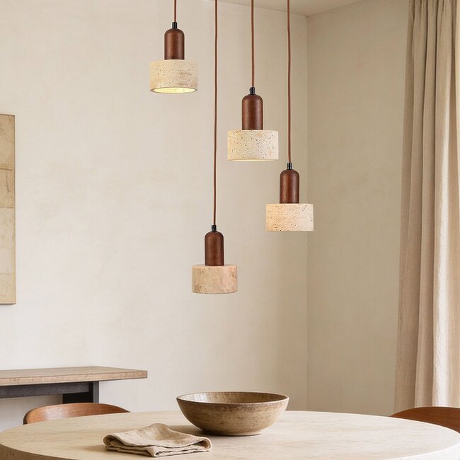 Soft lighting and natural textures give Muro a subtle, elegant look. The four round shades hang at different heights from a round ceiling plate and together provide pleasant, even lighting. Thanks to the use of natural stone and wood and its compact design, Muro is suitable for above a dining table, in a loft or as a subtle accent in the living room. The brown textile cables emphasise its natural character. Each shade is equipped with an E27 lampholder (light bulbs not included), so you can create the lighting atmosphere you desire.