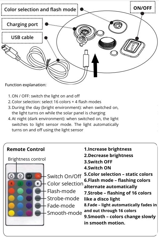The Helios solar table lamp with integrated RGBW LEDs is powered by a Li-battery. It is rechargeable and completely wireless. This makes it suitable, among other things, for installation in areas where there are no power lines. With the integrated LED system, you can create 18 different colours. In addition, there is a separate setting for a warm white colour temperature of 3000K. Besides the robust quality, Helios also has a stylish look. The classic white lampshade on a chic black base has an overall height of 50 cm. Thanks to the IP44 protection rating, it is splash-proof and can stay outside even in bad weather. Please see the manual for more information.