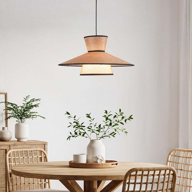 A minimalist pendant light with character – that's Zenith. With its clean lines, soft fabric details and powerful black accents, it elevates any interior. The Japandi influences create a warm overall look. Its generous 50 cm diameter gives it a clear presence without being overpowering. Thanks to its height-adjustable design (20 to 120 cm), Zenith effortlessly adapts to your space, whether above the dining table or as an eye-catcher in the hallway. Equipped with an E27 lampholder and suitable for bulbs up to 60W, allowing you to choose your desired lighting mood. Opt for warm white for cosiness, or bright light for focus – anything is possible. The colour combination of metal with a wood effect and matt black gives Zenith a contemporary look that feels both modern and natural.